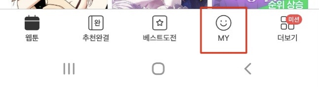 1. 어플 첫 화면에서 'MY'페이지로 들어가 줍니다. (네이버웹툰 - 하단, 네이버시리즈 - 상단)