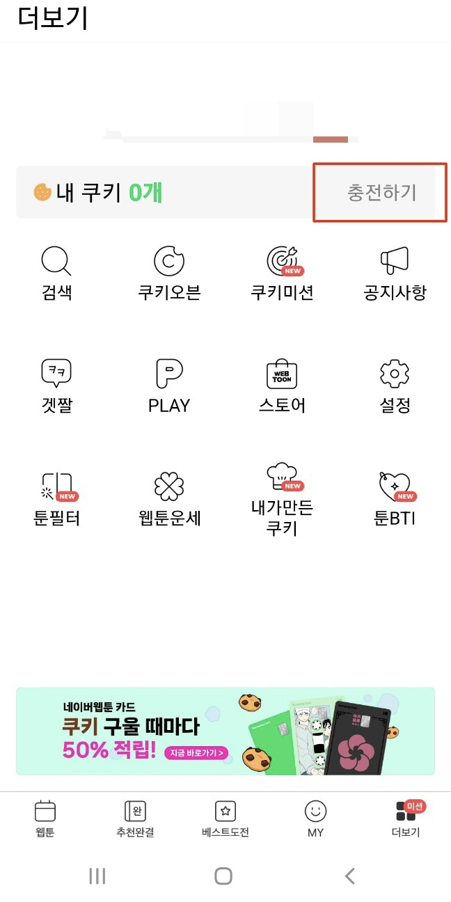 2. 쿠키 개수 옆에 위치한 '충전하기'를 눌러 줍니다.