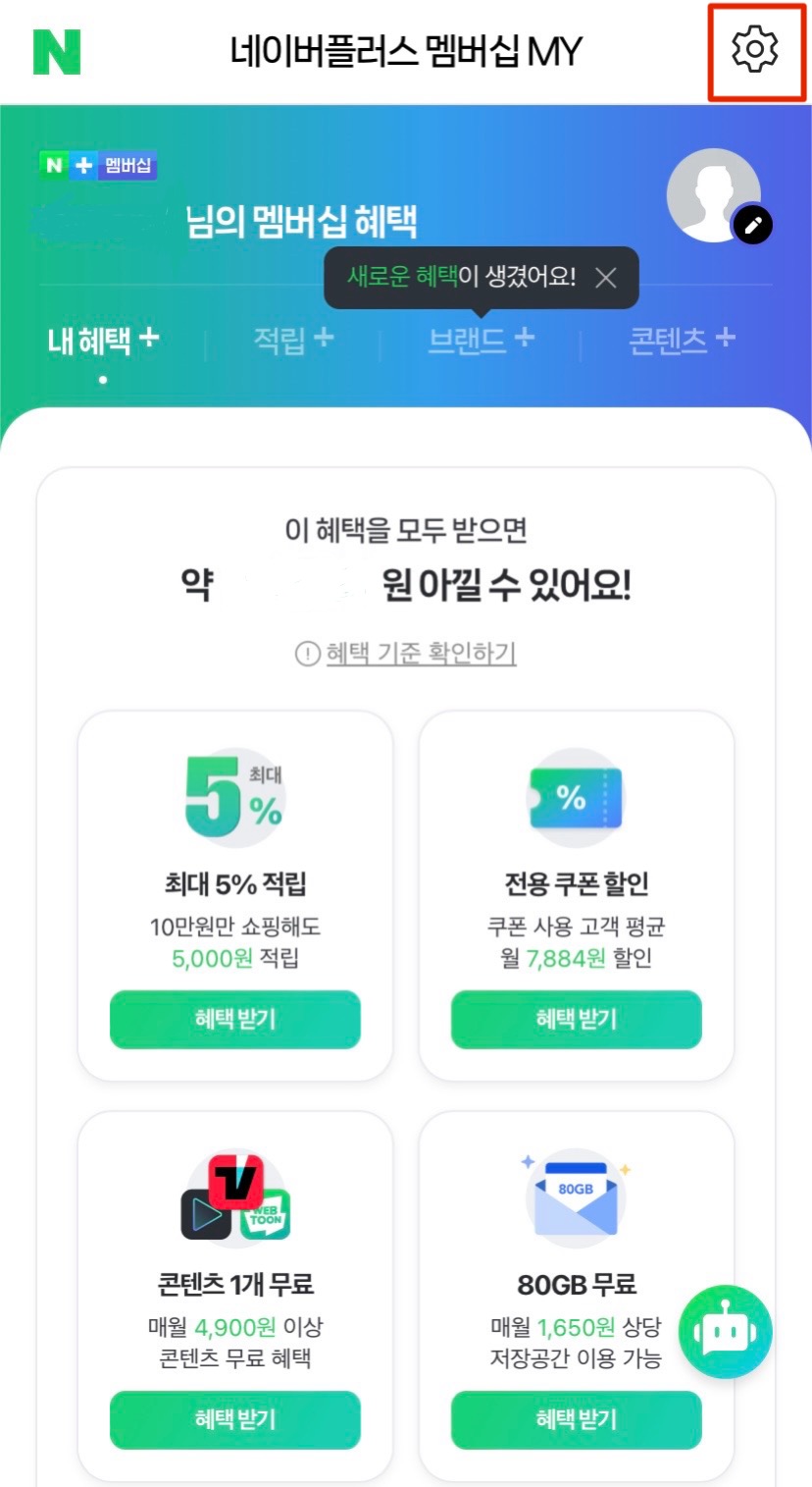 1. 네이버 앱에서 오른쪽 상단 버튼 > 네이버 플러스멤버십 클릭하여, "MY 네이버플러스 멤버십"에 들어가 줍니다.