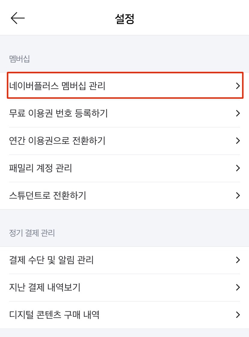 3. "네이버플러스 멤버십 관리"를 누른 뒤, 가장 아래까지 스크롤해줍니다.