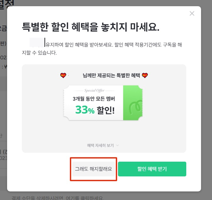 4. 세 개의 창이 뜨며 구독해지 이유와 해지를 막기 위한 내용이 순서대로 뜹니다. 무시하고 해지하겠다는 버튼을 계속 클릭해 주시면 됩니다.