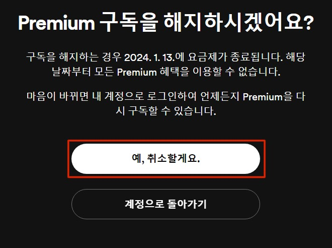 7. 구독을 해지하겠냐는 알림창에서 해지하겠다는 버튼을 한 번 더 눌러주면 해지가 됩니다.