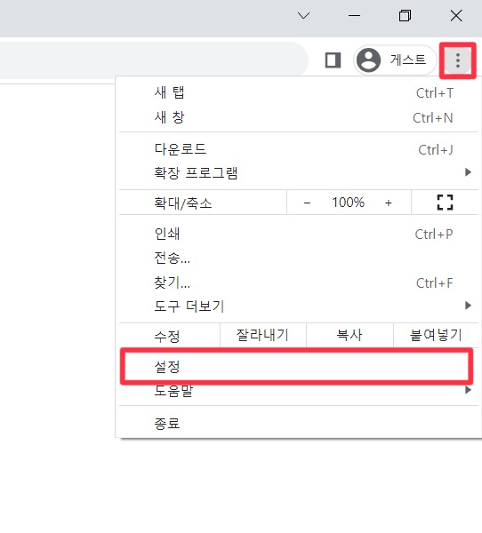 1. 크롬 웹페이지 우측 상단의 점 세 개 버튼을 누르고, '설정'을 클릭합니다.